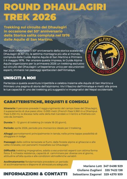 Per onorare questa impresa, le Aquile organizzano per la primavera 2026 un trekking esclusivo sul circuito del Dhaulagiri: un’esperienza unica per escursionisti esperti, immersi nei paesaggi spettacolari dell’Himalaya.