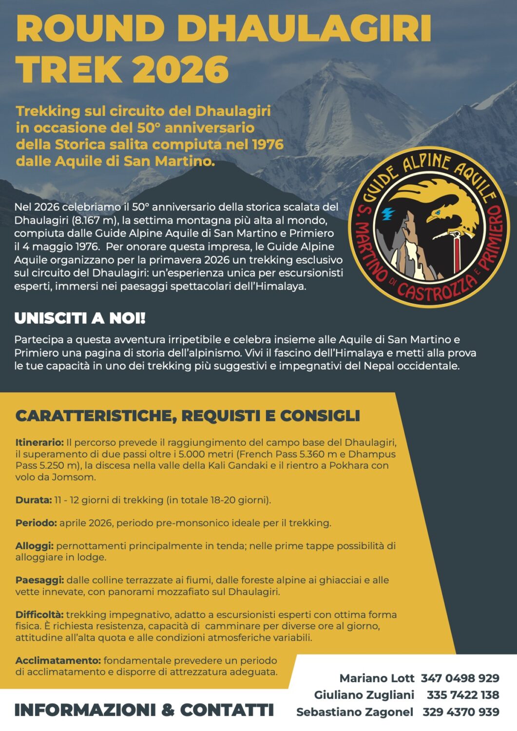 Nel 2026 celebriamo il 50° anniversario della storica scalata del Dhaulagiri (8.167 m), la settima montagna più alta al mondo, compiuta dalle Guide Alpine Aquile di San Martino e Primiero il 4 maggio 1976.